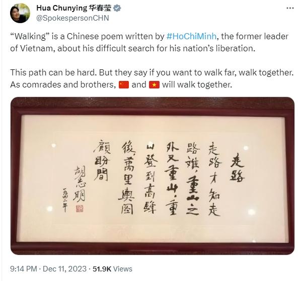 華春瑩寫(xiě)道,“《走路》是越南老一輩領(lǐng)導(dǎo)人胡志明所寫(xiě)的一首漢語(yǔ)詩(shī),講述了他爭(zhēng)取國(guó)家解放的艱難歷程。這條路可能很艱難。但人們說(shuō),如果想走得遠(yuǎn),就要一起走。作為同志和兄弟,中國(guó)和越南將一路同行?!?/p>