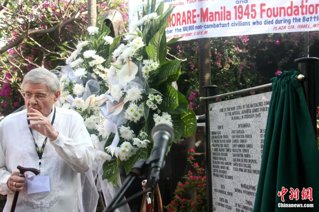 2015年2月14日,菲律賓“銘記馬尼拉1945基金會”在馬尼拉舉辦活動,紀(jì)念馬尼拉戰(zhàn)役70周年。圖為與會人士揭開記載日軍在馬尼拉多處實施大屠殺地點的牌匾。張明 攝