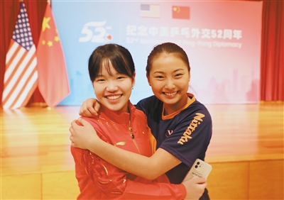 中美乒乓球運(yùn)動(dòng)員相擁致意。