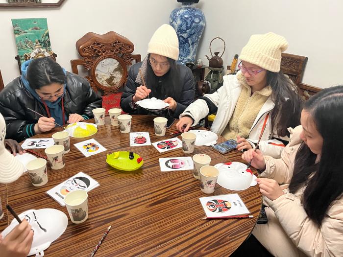 參觀完天壇之后,活動的下一站是在老北京胡同里體驗(yàn)戲劇臉譜繪制。在了解臉譜文化的起源與發(fā)展后,留學(xué)生們紛紛對“紅臉關(guān)公” “白臉曹操”感到新奇,大家迫不及待地圍坐在小桌前,一筆一劃地勾勒出屬于自己的臉譜,一個個惟妙惟肖。