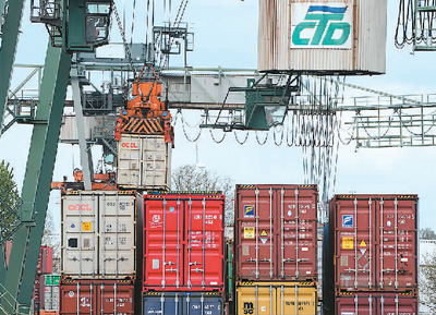 在德國(guó)多特蒙德港,機(jī)械設(shè)備在吊裝集裝箱。
