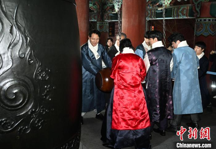 受疫情影響暫停的普信閣新年撞鐘活動時隔4年重新向市民開放。當?shù)貢r間1日0時,首爾市長吳世勛、公開推選出的12名市民代表和6名全球網絡紅人等22人分為4組撞鐘33次,宣布2024年的到來。