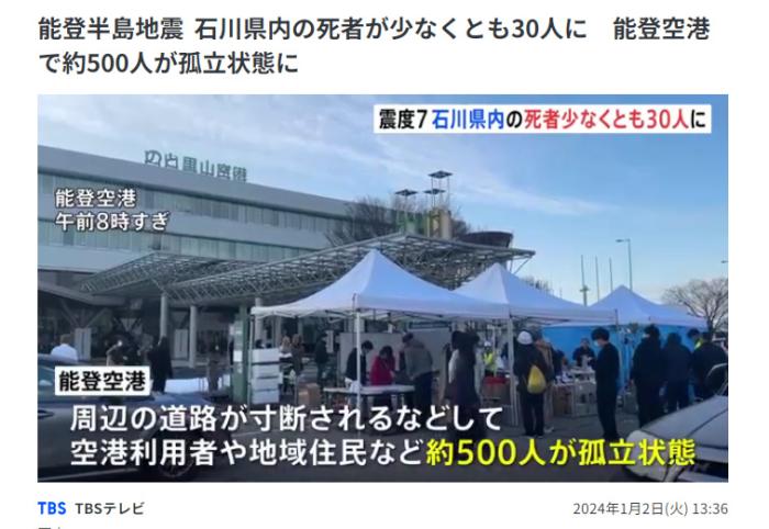 中新網(wǎng)1月2日電 據(jù)日本東京廣播公司(TBS)報(bào)道,截至目前,日本地震已造成石川縣至少30人死亡,當(dāng)局已確認(rèn)輪島市發(fā)生14起被困事件。