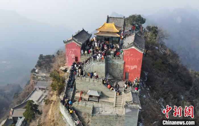 1月1日,武當山金頂上前來祈福的游客絡繹不絕。(無人機照片)張倩龍 攝