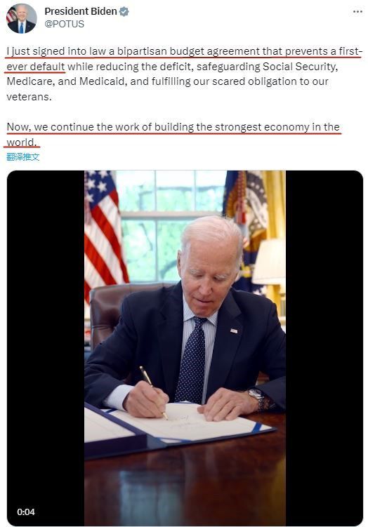 拜登當(dāng)時(shí)在社交媒體上寫(xiě)道:“我剛剛簽署了一項(xiàng)兩黨預(yù)算協(xié)議,防止有史以來(lái)第一次債務(wù)違約……現(xiàn)在,我們將繼續(xù)建設(shè)世界上最強(qiáng)大的經(jīng)濟(jì)體?!?/p>