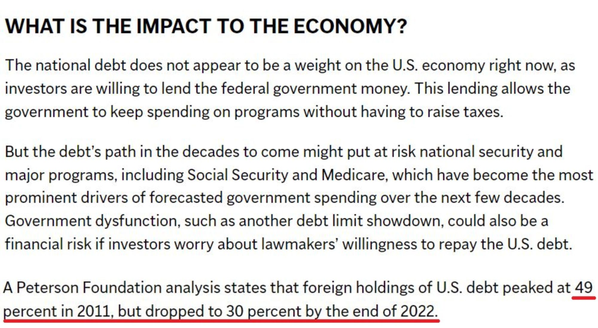 按照美國(guó)獨(dú)立權(quán)威經(jīng)濟(jì)研究智庫(kù)——彼得森基金會(huì)的說(shuō)法,規(guī)模龐大且不斷增加的債務(wù)“正威脅著美國(guó)的經(jīng)濟(jì)未來(lái)”,因?yàn)樵缇痛嬖诘摹敖Y(jié)構(gòu)性驅(qū)動(dòng)因素”已經(jīng)讓美國(guó)財(cái)政政策走上了一條“不可持續(xù)的道路”。