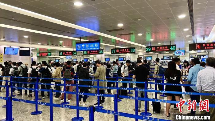 上海浦東國際機(jī)場邊檢查驗大廳,旅客有序排隊候檢。黃波 攝