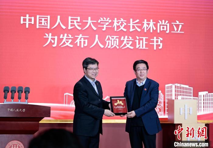 中國(guó)人民大學(xué)校長(zhǎng)林尚立為本次活動(dòng)成果發(fā)布人頒發(fā)證書(shū)。