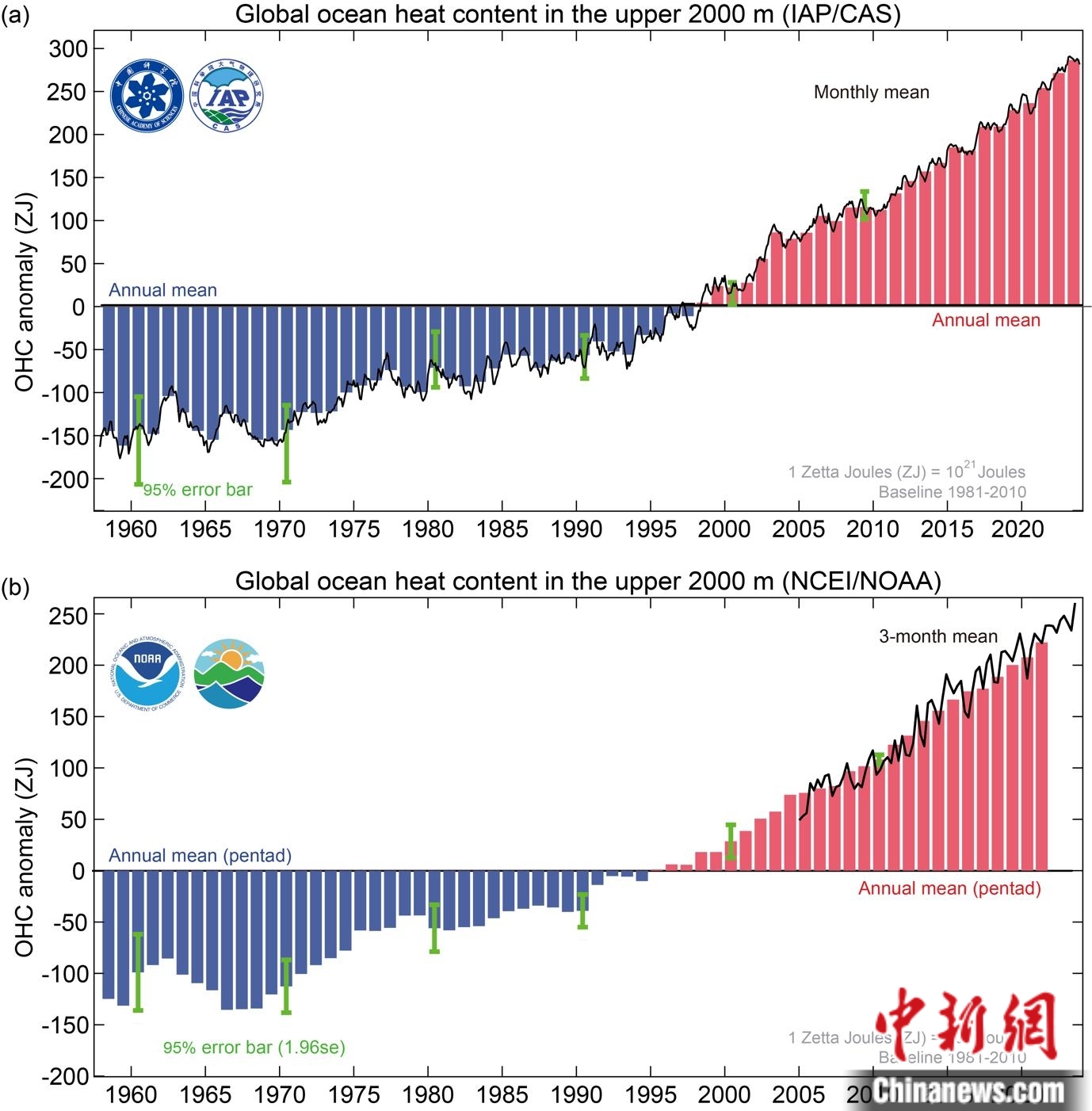 1958-2023年全球海洋上層2000米熱含量變化時間序列:上圖為IAP/CAS數據;下圖為NOAA/NCEI數據。中國科學院大氣物理研究所/供圖