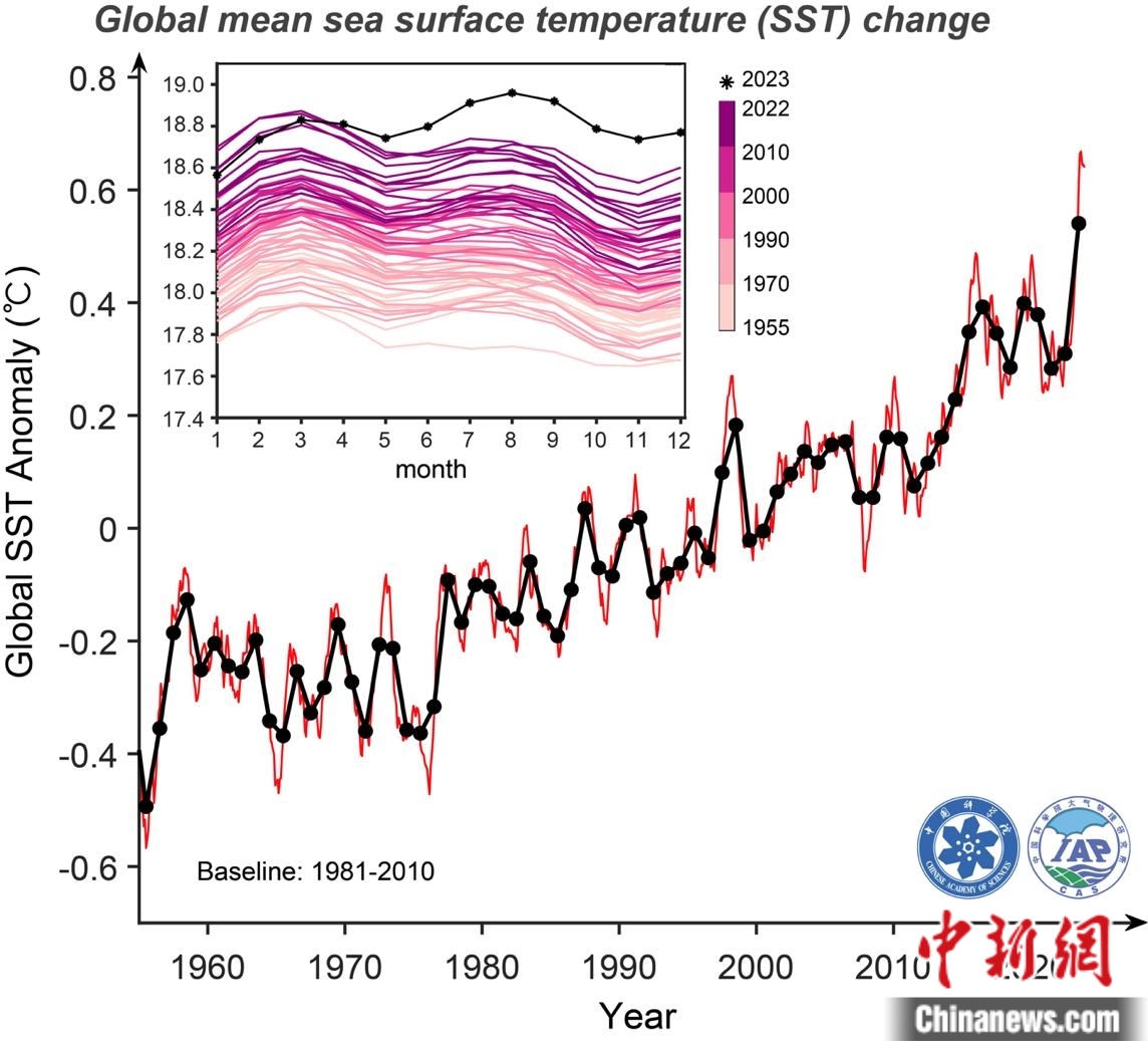 根據IAP/CAS溫度數據產品(1米層)分析的1955年至2023年12月全球平均海表溫度變化。黑線為年均值,紅色為月均值;異常值為相對于1981-2010年常年值;左上角內框為海表溫度的季節(jié)變化。中國科學院大氣物理研究所/供圖