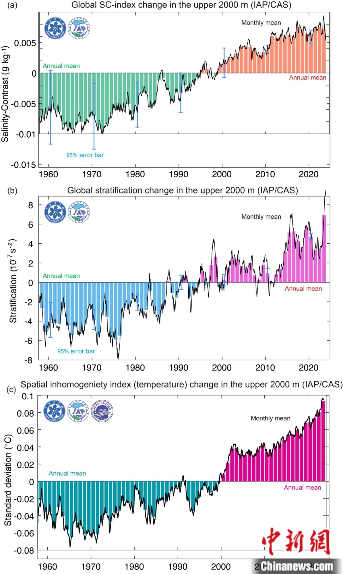 1958-2023年全球海洋上層2000米鹽度差指數SC(a)、層結(b)、溫度空間非均勻性指數(c)變化時間序列。黑色線條為月度變化,條狀色條為年變化。中國科學院大氣物理研究所/供圖