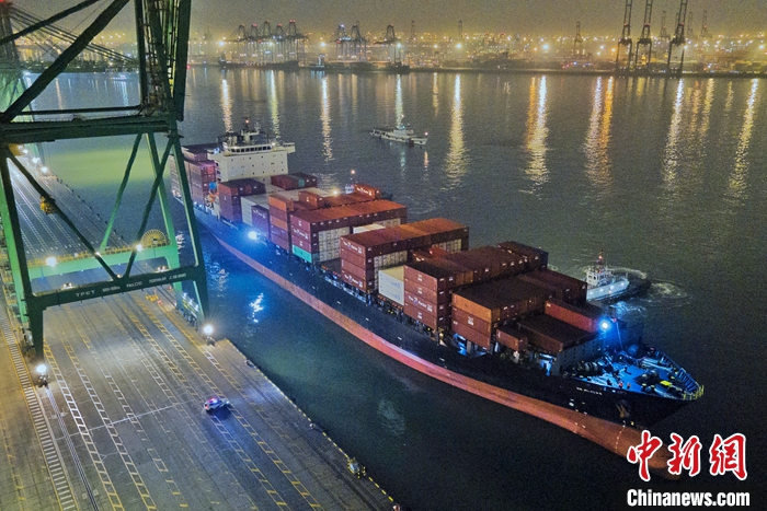 1月16日晚,裝載著2500余噸智利車?yán)遄拥拇笮图b箱班輪“巴赫”號,順利抵達(dá)天津港太平洋國際集裝箱碼頭,標(biāo)志著天津港與南美洲直航的首條“車?yán)遄涌炀€”正式開通。“車?yán)遄涌炀€”始發(fā)于智利圣安東尼奧港,直抵天津港。未來一周,還將有2艘次智利車?yán)遄迂洿诌_(dá)天津港,累計8300噸車?yán)遄蛹捌渌厦乐蕻a(chǎn)品從天津港上岸。(無人機(jī)照片) 中新社記者 佟郁 攝