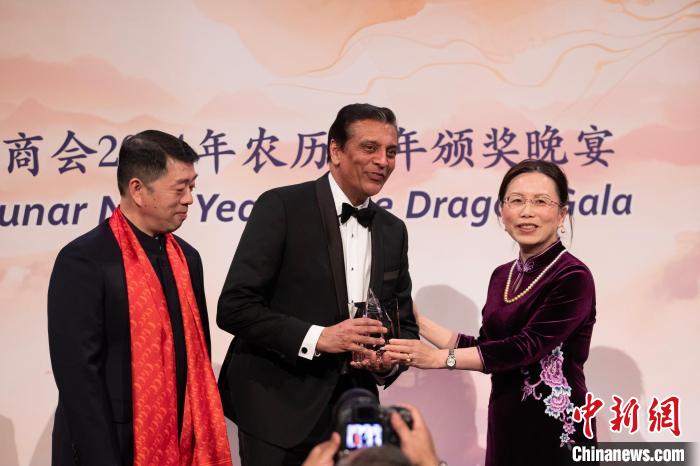 當(dāng)?shù)貢r(shí)間1月18日,美國中國總商會(CGCC)在紐約舉行2024年農(nóng)歷龍年頒獎晚宴。圖為中國駐美國大使館公使徐學(xué)淵(右)為聯(lián)邦快遞總裁兼首席執(zhí)行官拉杰·蘇巴馬廉(中)頒發(fā)“國際領(lǐng)導(dǎo)力獎”?!≈行律缬浾?廖攀 攝