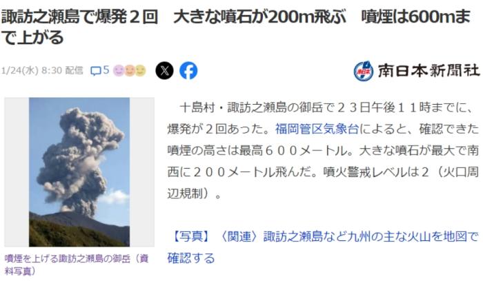 福岡管區(qū)氣象臺(tái)發(fā)布消息稱,噴出的煙柱最高達(dá)600米,巨大的火山石向外飛出200米。目前,當(dāng)?shù)匾呀?jīng)將火山噴發(fā)警戒提高到2級(jí),火山口周邊區(qū)域禁止入內(nèi)。