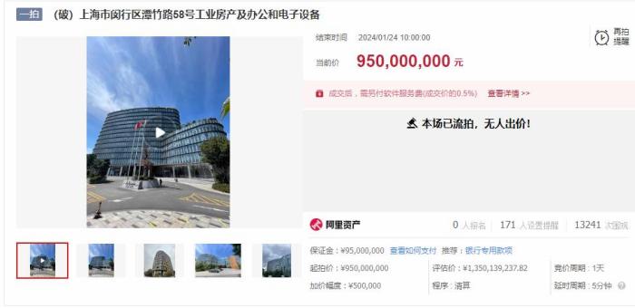 本次拍賣標(biāo)的評估總價(jià)約為13.5億元,以9.5億元的價(jià)格起拍,約為評估總價(jià)的7折。拍賣于1月23日上午10時(shí)至1月24日上午10時(shí)止,雖然這場拍賣有超過1.3萬人圍觀,但最終無人出價(jià),以流拍結(jié)束。