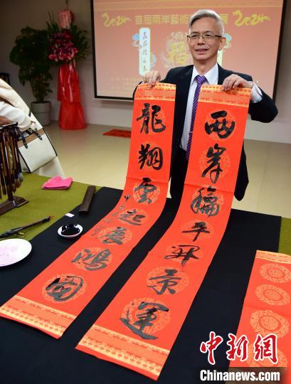 1月28日,兩岸藝術(shù)家春聯(lián)展在臺北江山如此多嬌藝術(shù)館舉行。圖為臺灣中華書道學(xué)會理事長楊旭堂當(dāng)場揮毫?xí)鴮憽皟砂逗推介_景運(yùn),龍翔云起展鴻圖”。中新網(wǎng)記者 路梅 攝