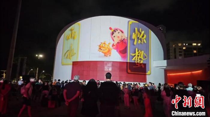 當(dāng)天晚上,多娜·琳杜公園內(nèi)劇院的外墻,投影出中國文化元素?zé)艄庑恪.嬅嬷?,十二個(gè)生肖福娃次第給觀眾拜年,中國傳統(tǒng)時(shí)令節(jié)氣習(xí)俗一一展演,格外吸睛。