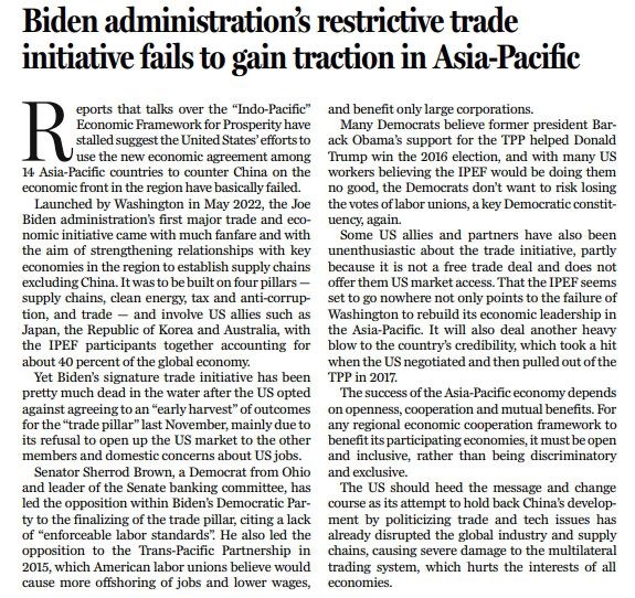 如今美國(guó)的一些盟友及伙伴也開(kāi)始對(duì)IPEF失去了熱情,部分原因在于該框架并非自由貿(mào)易協(xié)定,也沒(méi)有提供給他們進(jìn)入美國(guó)市場(chǎng)的機(jī)會(huì)。IPEF似乎已經(jīng)是“窮途末路”,它的處境,映證的是美國(guó)在重塑亞太地區(qū)經(jīng)濟(jì)領(lǐng)導(dǎo)力方面的失敗,也令美國(guó)自2017年退出TPP后再次“信譽(yù)掃地”。