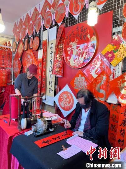 2月4日正逢立春,臺(tái)北迪化街上的商家正在書寫龍年春聯(lián)。中新社記者 路梅 攝
