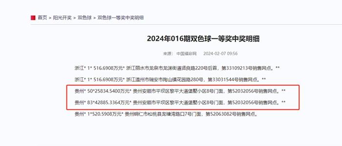 據(jù)中國(guó)福彩網(wǎng)顯示,在貴州省安順市52032056號(hào)銷售網(wǎng)點(diǎn)銷售的兩張一等獎(jiǎng)中獎(jiǎng)彩票中,一張彩票一等獎(jiǎng)中獎(jiǎng)數(shù)量為50注,中獎(jiǎng)金額為25834.5400萬(wàn)元,另一張中獎(jiǎng)數(shù)量為83注,金額為42885.3364萬(wàn)元。