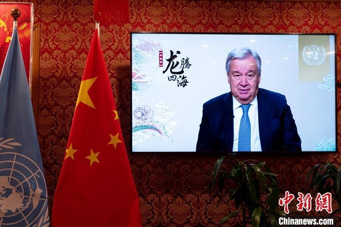 當(dāng)?shù)貢r(shí)間2月6日,聯(lián)合國秘書長(zhǎng)古特雷斯通過視頻發(fā)表新春致辭,向中國人民和全球華人致以農(nóng)歷甲辰龍年的祝福和問候。圖為中國常駐聯(lián)合國代表團(tuán)紐約駐地的屏幕播放致辭。 中新社記者 王帆 攝