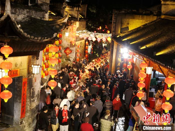 中新網懷化2月10日電 (付敬懿 李林)“開席咯,上頭碗,大吉大利,黃精燉雪峰烏骨雞;第二碗,前程似錦,黔陽雪粑鴨;第三碗,牛氣沖天,干鍋高山黃牛肉;第四碗,年年有余,黃燜昌齡魚……”2月9日晚,除夕夜,湖南懷化洪江市黔陽古城內,一張張桌子擺滿大街小巷,當?shù)鼐用窈陀慰凸矅L長龍宴,歡迎龍年到來。
