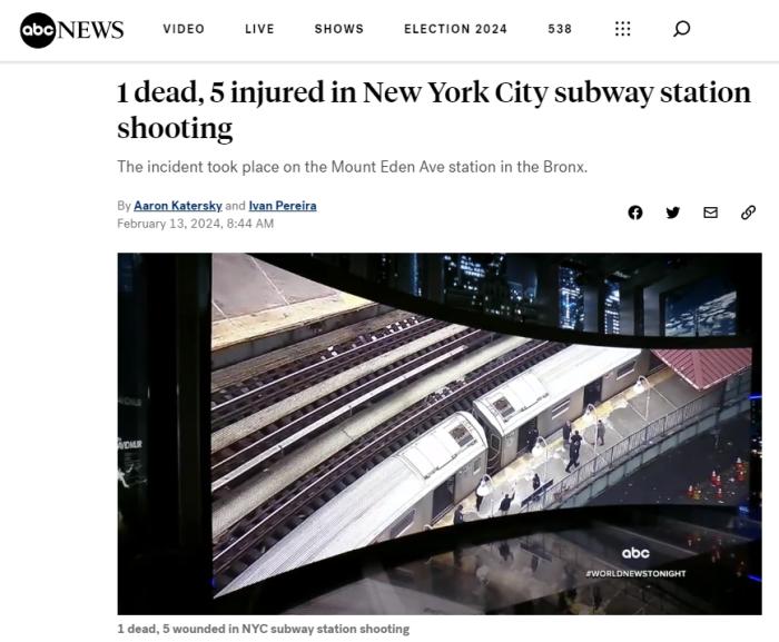 中新網(wǎng)2月13日電 據(jù)美國廣播公司(ABC)報(bào)道,當(dāng)?shù)貢r(shí)間12日下午,美國紐約布朗克斯一個(gè)地鐵站發(fā)生槍擊事件,造成1人死亡,5人受傷。