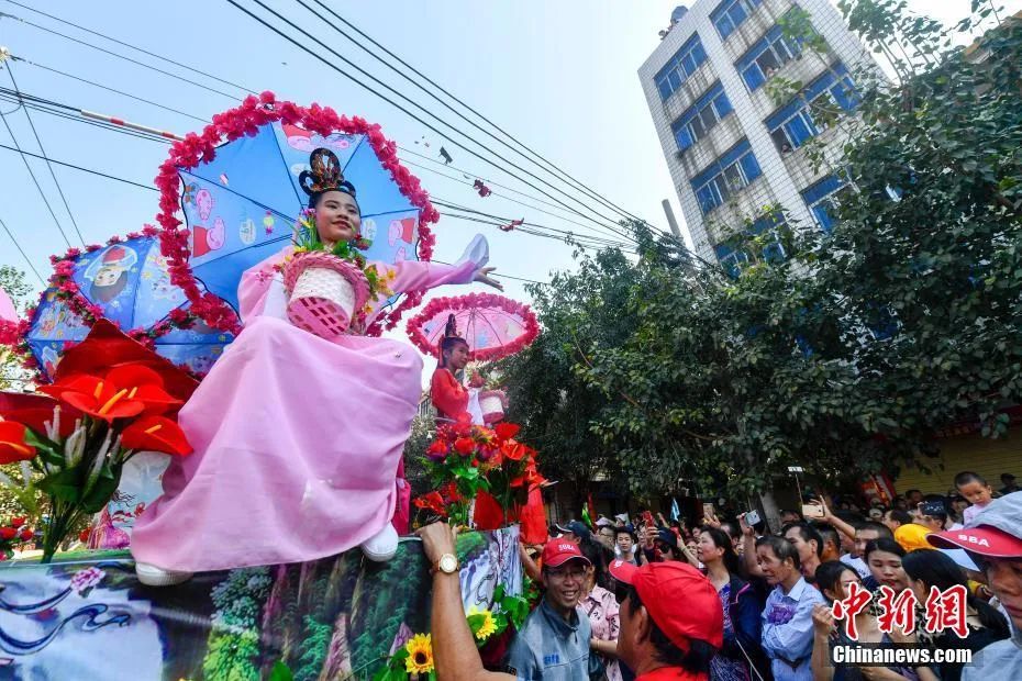 由小朋友裝扮的“仙女”向民眾撒花。駱云飛 攝