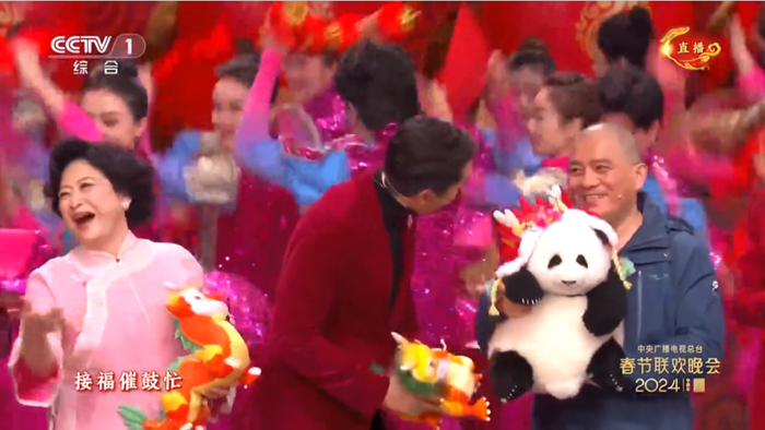 春晚觀眾席上,大熊貓飼養(yǎng)員“譚爺爺”帶著花花玩偶一起亮相,“花花”的頭上還戴了一頂可愛的龍帽。