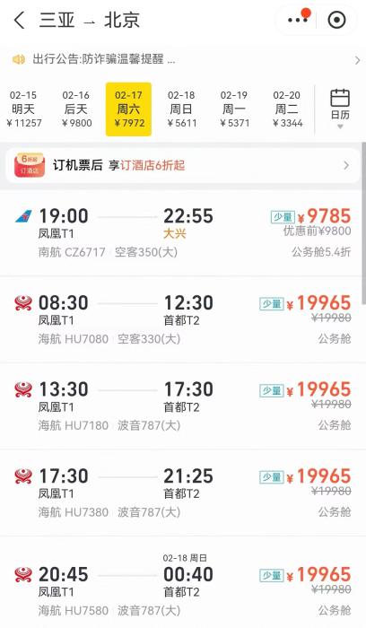 中新財(cái)經(jīng)記者14日晚間查詢發(fā)現(xiàn),2月15日至2月19日,??凇⑷齺喴约碍偤V憋w北京和上海兩大目的地的經(jīng)濟(jì)艙機(jī)票均已售罄。15日至17日的回程高峰期,公務(wù)艙機(jī)票價(jià)格集中在萬元上下。17日當(dāng)天,從三亞直飛北京的公務(wù)艙機(jī)票價(jià)格最高已接近兩萬元。