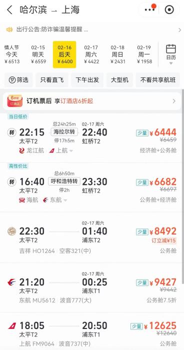 這個冬天,“爾濱”出圈,帶動?xùn)|北旅游熱。16日至17日,從哈爾濱、沈陽直飛北京、上海的機(jī)票只剩高價(jià)公務(wù)艙,長春直飛這兩大目的地的機(jī)票僅余少量經(jīng)濟(jì)艙。其中,哈爾濱飛往上海的部分公務(wù)艙價(jià)格已經(jīng)上萬,哈爾濱飛往其他熱門目的地的機(jī)票價(jià)格也動輒五六千元。