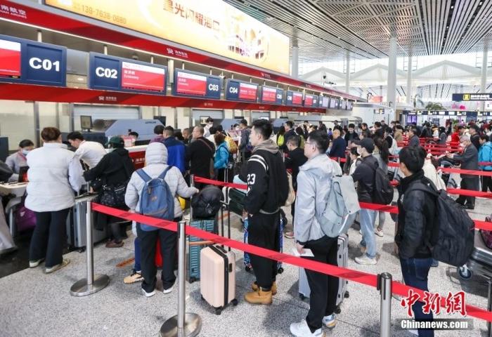2月8日,海南???,旅客在海口美蘭國際機(jī)場T2航站樓排隊(duì)辦理值機(jī)。春節(jié)臨近,??诿捞m國際機(jī)場客流攀升。中新社記者 駱云飛 攝