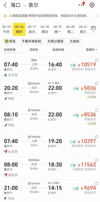 在社交平臺上,一些網(wǎng)友還提供了“聯(lián)程甩尾”方案。例如,從海口直飛北京,16日票價(jià)要近萬元,但如果選擇海口飛往首爾,從北京中轉(zhuǎn),票價(jià)最低僅需五千多元。
