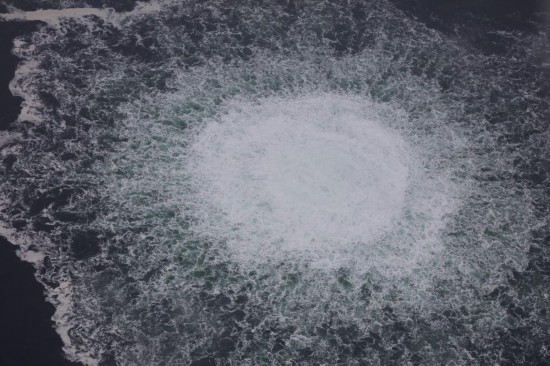 這張瑞典海岸警衛(wèi)隊2022年9月27日發(fā)布的航拍照片顯示的是一處“北溪”天然氣管道泄漏點。新華社發(fā)(瑞典海岸警衛(wèi)隊供圖)