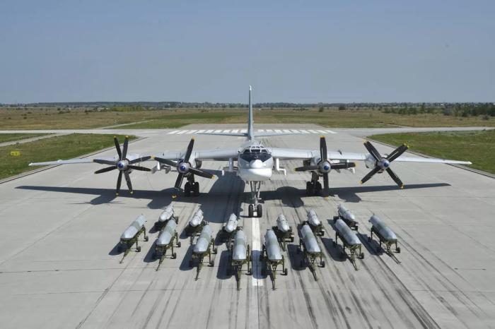 俄一架圖-95MS轟炸機(jī)前擺放著14枚導(dǎo)彈。圖片來源:俄羅斯國防部