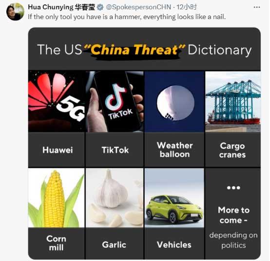 華春瑩最后回?fù)簦叭绻阄ㄒ坏墓ぞ呤清N子,那么所有東西看起來(lái)都像釘子?!边@條帖文隨附圖片上,列出美國(guó)以往炒作“中國(guó)威脅”的詞典:包括華為,TikTok,氣象無(wú)人飛艇,起重機(jī),玉米加工廠,大蒜,汽車……還有更多,取決于政治因素。↓
