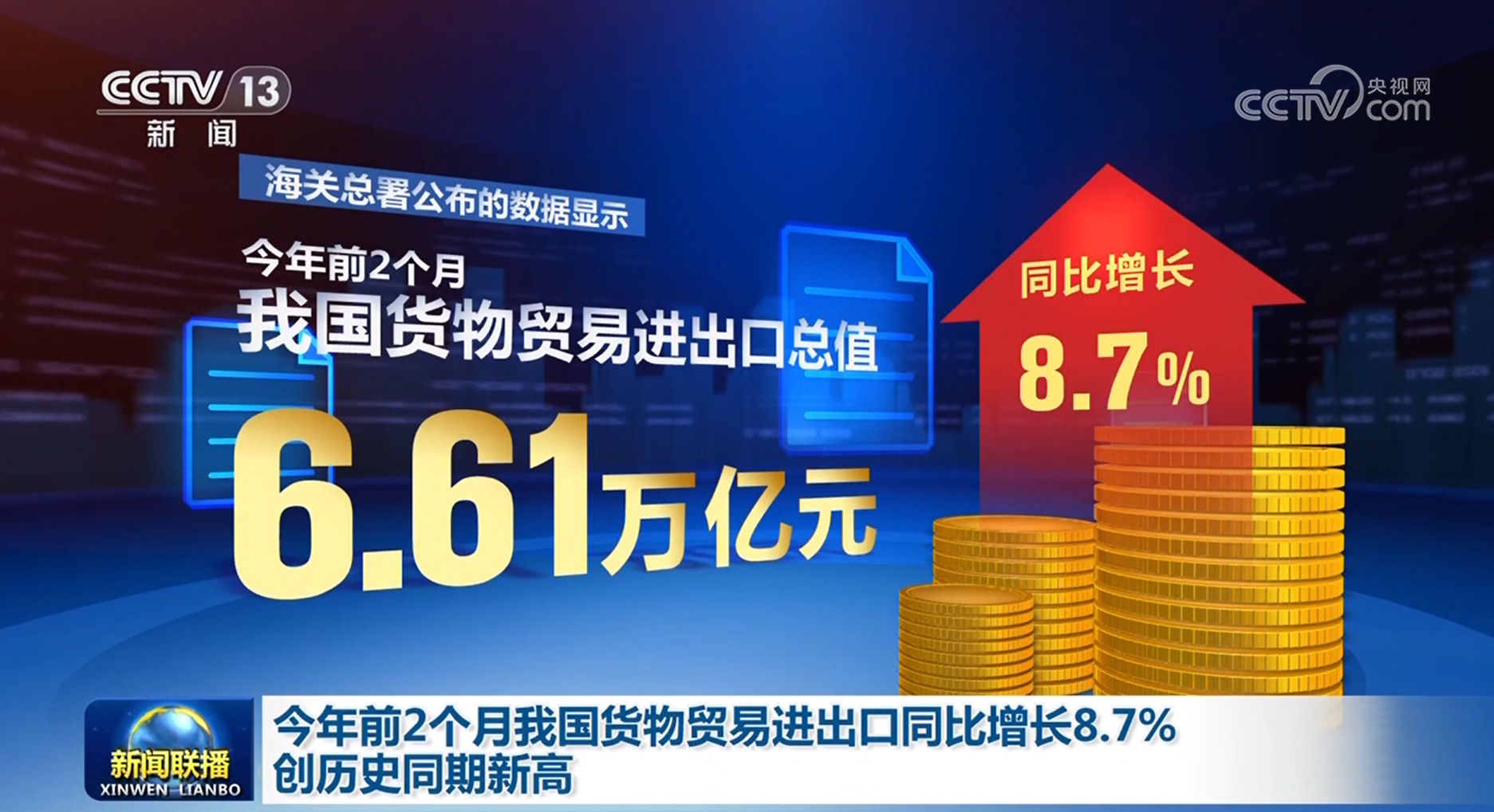 央視網消息(新聞聯(lián)播):記者今天(3月7日)從海關總署獲悉,今年前2個月,我國貨物貿易進出口規(guī)模創(chuàng)歷史同期新高,外貿實現(xiàn)良好開局。