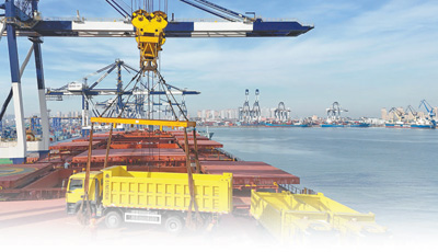 一批工程車輛在山東港口煙臺港裝入中非班輪,將發(fā)往幾內(nèi)亞馬瑞巴亞港,投入當?shù)鼗A(chǔ)設(shè)施建設(shè)。