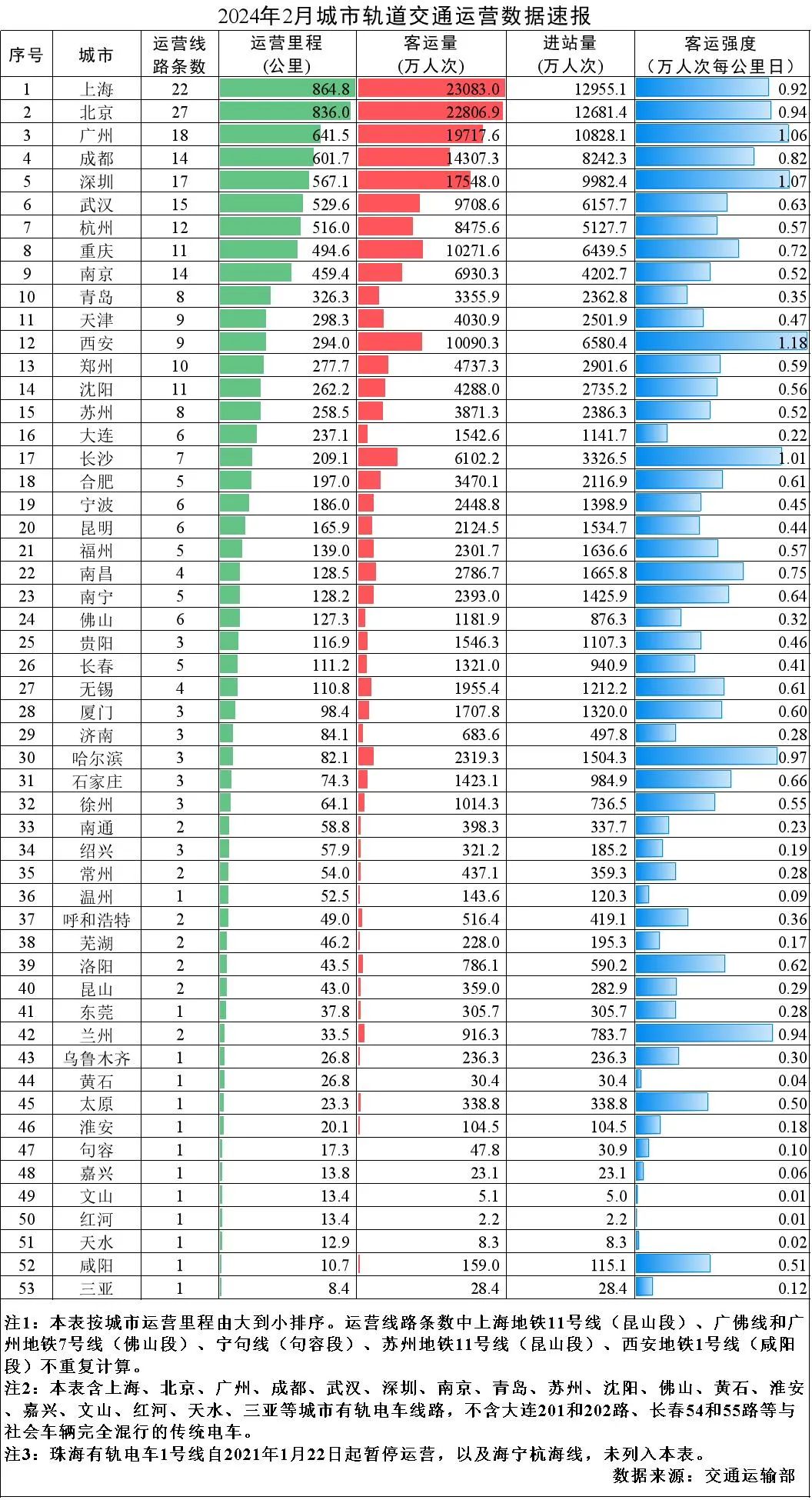 中新網(wǎng)3月12日電 據(jù)交通運(yùn)輸部微信公眾號(hào)消息,2024年2月,31個(gè)省(自治區(qū)、直轄市)和新疆生產(chǎn)建設(shè)兵團(tuán)共有55個(gè)城市開(kāi)通運(yùn)營(yíng)城市軌道交通線路308條,運(yùn)營(yíng)里程10205.6公里,實(shí)際開(kāi)行列車317萬(wàn)列次,完成客運(yùn)量20.5億人次,進(jìn)站量12.4億人次。2月份,客運(yùn)量環(huán)比減少6.1億人次,降低22.9%,同比減少1.3億人次,降低6%。2月份全國(guó)總運(yùn)營(yíng)里程的平均客運(yùn)強(qiáng)度為0.693萬(wàn)人次每公里日,環(huán)比降低17.6%,同比降低14.4%。本月無(wú)新開(kāi)通線路。