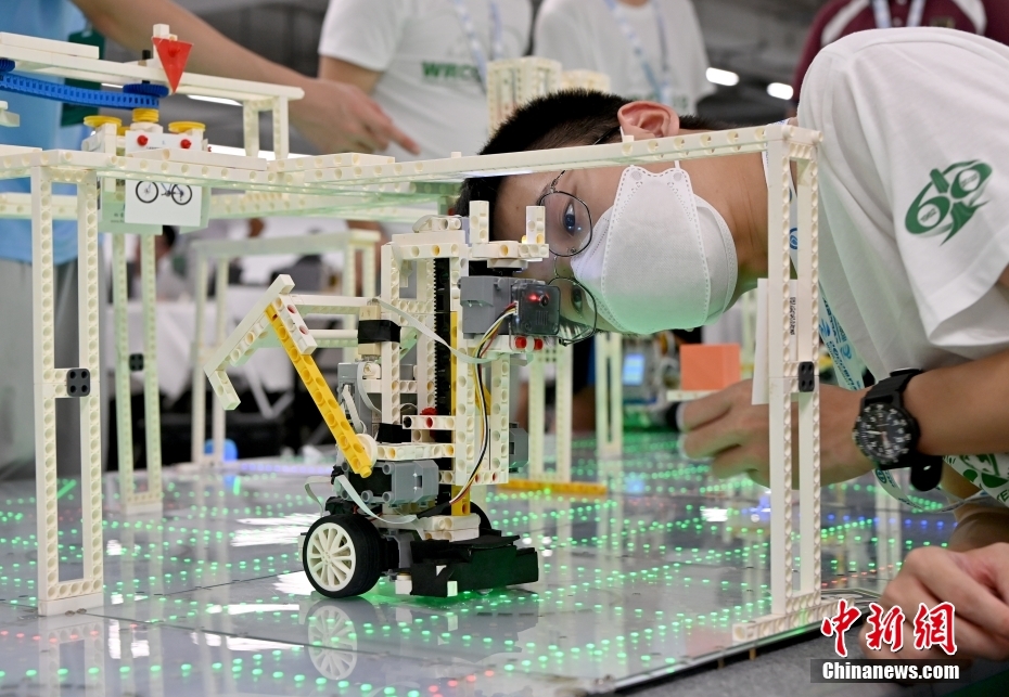資料圖:一名學生在觀摩自己設(shè)計編程的機器人。中新社記者 侯宇 攝