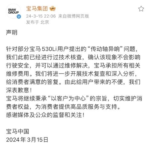 當(dāng)晚,寶馬集團(tuán)也發(fā)布聲明稱,“針對(duì)部分寶馬530Li用戶提出的‘傳動(dòng)軸異響’問題,我們此前已經(jīng)進(jìn)行過技術(shù)核查,確認(rèn)該現(xiàn)象不會(huì)影響行駛安全,并可以通過維修解決,寶馬承擔(dān)所有相關(guān)維修費(fèi)用。我們將進(jìn)一步開展技術(shù)復(fù)查和深入分析,給消費(fèi)者滿意的答復(fù)。由此給用戶帶來的不便,我們深表歉意!”