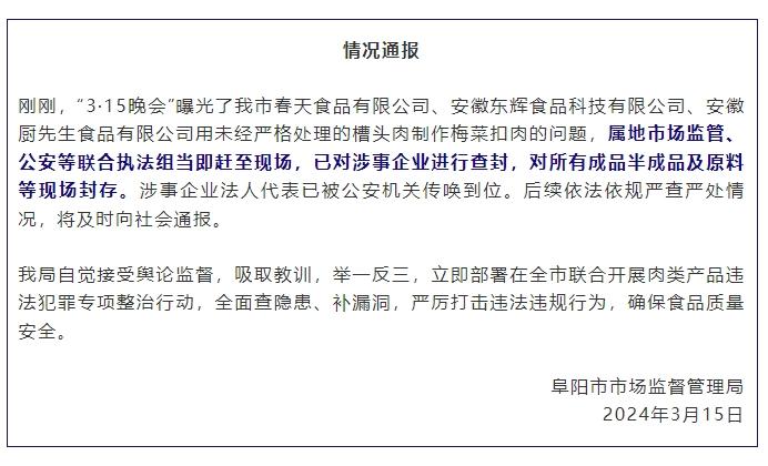 涉事企業(yè)所在的阜陽市市場監(jiān)督管理局當(dāng)晚發(fā)布情況通報(bào)稱,屬地市場監(jiān)管、公安等聯(lián)合執(zhí)法組當(dāng)即趕至現(xiàn)場,已對(duì)涉事企業(yè)進(jìn)行查封,對(duì)所有成品半成品及原料等現(xiàn)場封存。涉事企業(yè)法人代表已被公安機(jī)關(guān)傳喚到位。后續(xù)依法依規(guī)嚴(yán)查嚴(yán)處情況,將及時(shí)向社會(huì)通報(bào)。