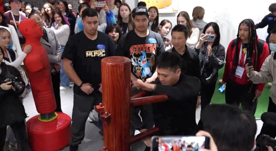 詠春拳木人樁、梅花樁、長(zhǎng)矛等武術(shù)表演,引來(lái)代表團(tuán)中的學(xué)生們踴躍體驗(yàn)。