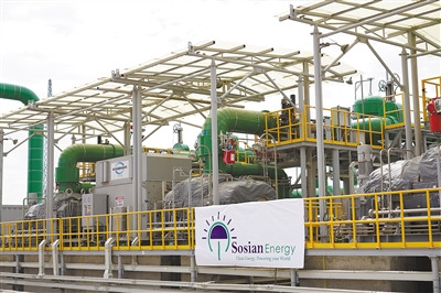 由中國企業(yè)承建的肯尼亞索西安地?zé)犭娬居谌ツ?月底投產(chǎn)送電,成為非洲首個從設(shè)計、產(chǎn)品生產(chǎn)到建設(shè)、調(diào)試完全由中國企業(yè)獨立完成的地?zé)岚l(fā)電站。該電站設(shè)計裝機容量35兆瓦,每年可減少二氧化碳排放24萬噸。圖為索西安地?zé)犭娬?號發(fā)電機組。