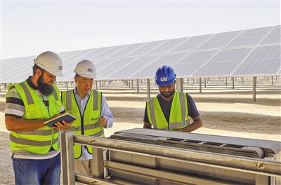 由中國企業(yè)總承包的阿聯(lián)酋艾爾達(dá)芙拉光伏電站可供20萬戶居民用電,每年減少二氧化碳排放240萬噸,使清潔能源在阿聯(lián)酋總能源結(jié)構(gòu)中的比重提高到13%以上。圖為中外員工在艾爾達(dá)芙拉光伏電站工作。