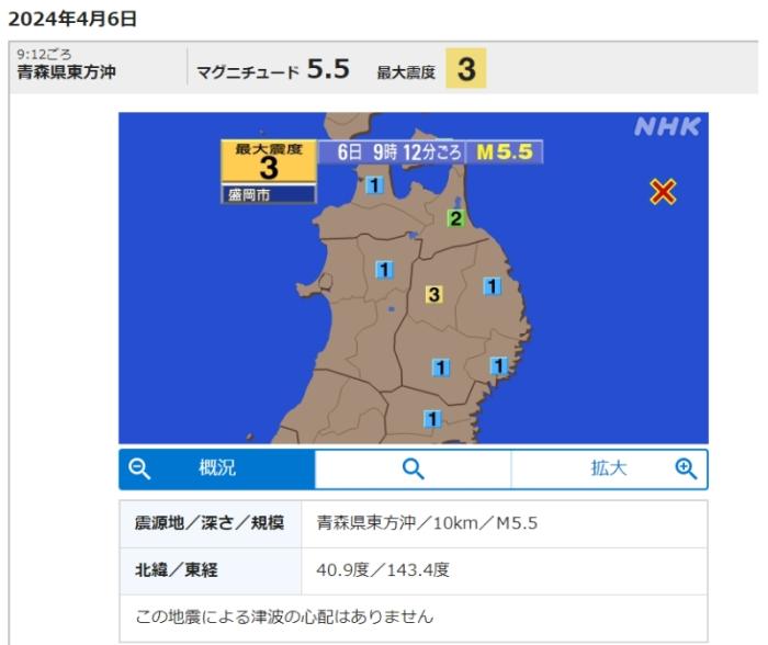 中新網(wǎng)4月6日電 據(jù)日本廣播協(xié)會(NHK)報道,當?shù)貢r間6日9時12分,日本青森縣海域發(fā)生5.5級地震,震源深度10千米。