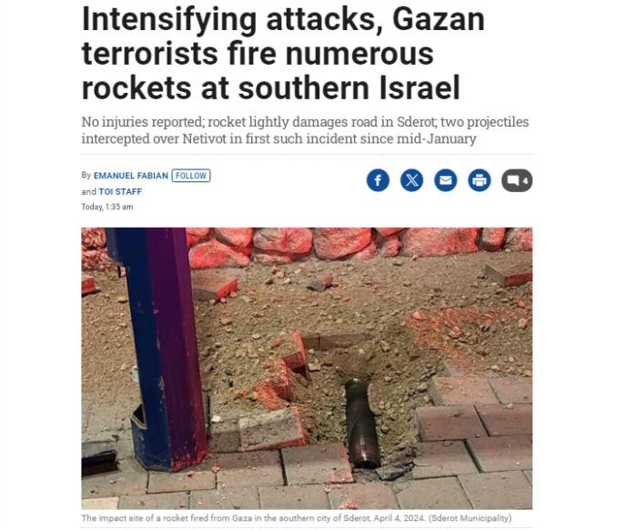 中新網(wǎng)4月5日電 據(jù)《以色列時報》報道,當(dāng)?shù)貢r間4日晚,以色列國防軍表示,以色列南部城市斯代羅特遭加沙地帶發(fā)射的兩枚火箭彈襲擊。