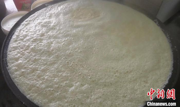煮豆?jié){時(shí),一口可以裝滿200公斤豆?jié){的鐵鍋,被一點(diǎn)點(diǎn)地裝滿,綿密的泡沫溢滿了整個(gè)鐵鍋,爐灶中的柴火通過(guò)燃燒散發(fā)出獨(dú)有的清香。