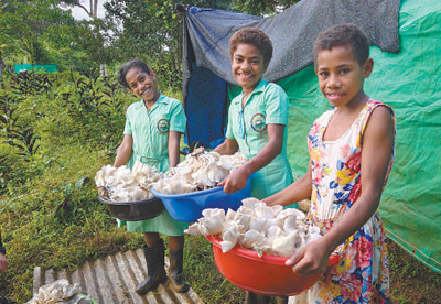 中國政府面向斐濟等太平洋島國推廣菌草技術(shù),推動當?shù)亟?jīng)濟發(fā)展,助力當?shù)孛裆纳啤D為在斐濟奈塔希里乳業(yè)婦女組織菌草技術(shù)示范點,孩子們正在幫忙采菇。