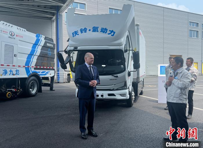 博世氫動(dòng)力系統(tǒng)(重慶)有限公司是朔爾茨訪渝首站參觀地。該公司由博世與慶鈴汽車(chē)合資建立,致力于將博世氫燃料電池解決方案引入中國(guó)市場(chǎng)。在參訪點(diǎn)入口,四輛冷鏈物流、環(huán)衛(wèi)及牽引車(chē)等依次停放。這些車(chē)全為中國(guó)國(guó)產(chǎn)汽車(chē),使用博世氫動(dòng)力系統(tǒng)(重慶)有限公司出產(chǎn)的氫動(dòng)力模塊。朔爾茨在企業(yè)相關(guān)負(fù)責(zé)人的介紹下,了解博世與中企合作的最新成果。在工作人員指引下,朔爾茨為完成預(yù)裝的氫動(dòng)力模塊拴緊最后一顆螺絲,向身邊工作人員豎起了大拇指。